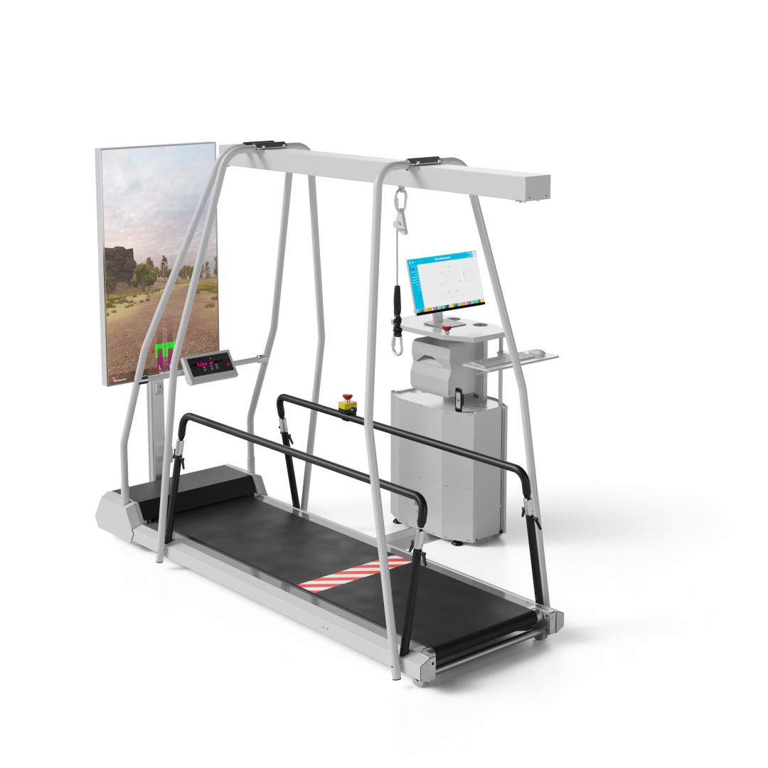 พื้น AR ฝึกจังหวะการก้าวพร้อมจอ VR ฝึกการทรงตัว ต่อยอดจากรุ่นพื้นฐานโดยเพิ่มหน้าจอ Virtual Reality เพื่อสร้างสภาพแวดล้อมที่มีความซับซ้อนมากขึ้น เช่น การฝึกเดินขณะทำหลายกิจกรรมพร้อมกัน (Dual-tasking) หรือการตอบสนองต่อสิ่งกระตุ้น ช่วยส่งเสริมการฟื้นตัวที่ใกล้เคียงกับสภาพแวดล้อมจริง